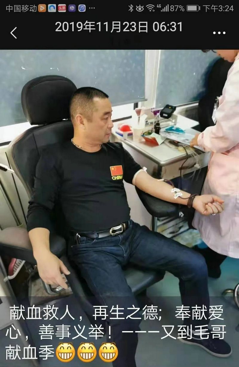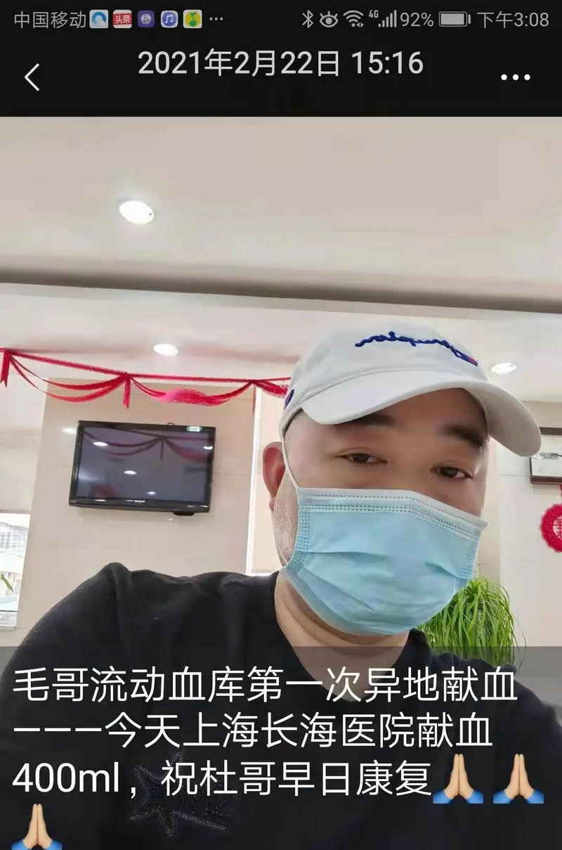 毛哥流動血庫第一次異地獻(xiàn)血——今天上海長海醫(yī)院獻(xiàn)血400ml,祝杜哥早日康復(fù)。