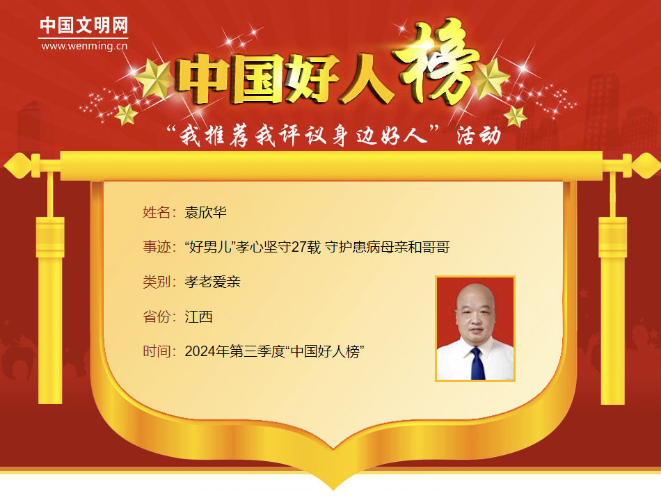 ??袁欣華,男,1978年1月生,江西省景德鎮(zhèn)市昌南新區(qū)消防救援大隊(duì)政府專職消防員。自1997年父親重病去世后,留下了患有阿爾茲海默病的母親和體弱多病的哥哥。27年來,袁欣華獨(dú)自操持著家里各種事情,從日常起居到吃穿住行,從日夜陪伴到看病治療,他一個(gè)人無微不至地照顧著母親和哥哥。袁欣華曾獲“江西好人”等榮譽(yù)。