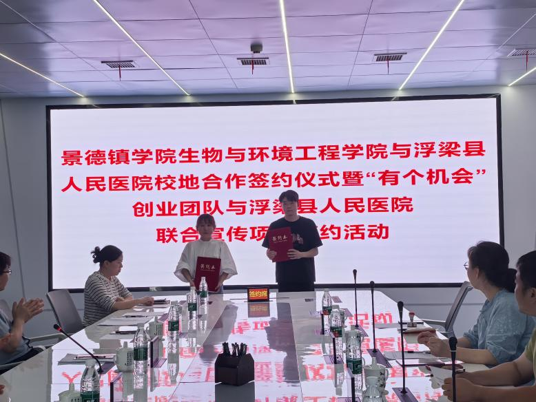 之后,施迪分別介紹了《景德鎮(zhèn)學(xué)院生環(huán)學(xué)院與浮梁縣人民醫(yī)院校地合作協(xié)議》《“有個機(jī)會” 創(chuàng)業(yè)團(tuán)隊(duì)與浮梁縣人民醫(yī)院短視頻宣傳合作合同》的主要內(nèi)容,雙方代表簽訂了校地合作協(xié)議和宣傳合作合同,并交換協(xié)議文本,握手合影留念。