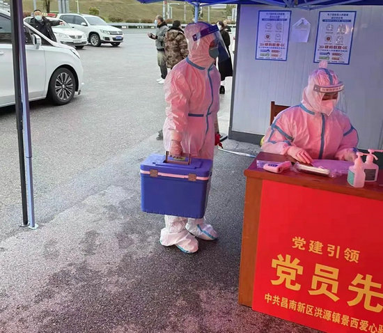 市疾控中心黨員志愿者在昌南新區(qū)洪源鎮(zhèn)景西愛(ài)心驛站接收核酸檢測(cè)樣本。