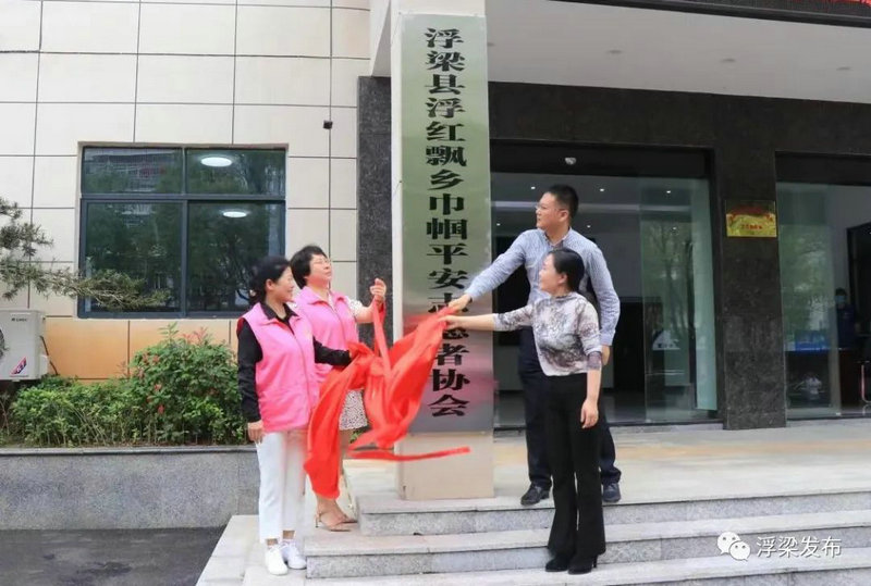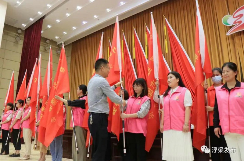余小蘭、曹火根等為縣“浮紅飄鄉(xiāng)”巾幗平安志愿者協(xié)會(huì)揭牌,曹火根為協(xié)會(huì)授旗。